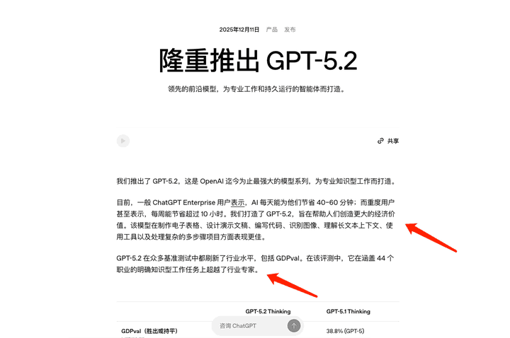 凌晨chatgpt5.2发布,虽然很多参数较gemini3.0还是有差距,但依然是一个值得去付费订阅的一个版本。