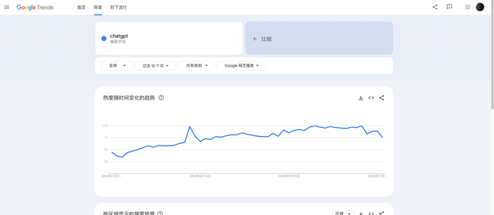 很清晰能看到,chatgpt 和 Gemini 在过去一年里,后者的搜索量比前者小很多。说明 chatgpt 一直很火。Gemini 有稳步向上的趋势。