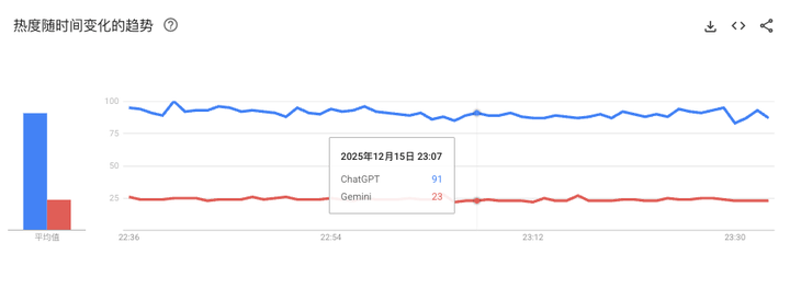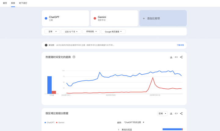在多词模式下,则可以看到两个词语的相对搜索量对比。比如 chatgpt 和 Gemini: