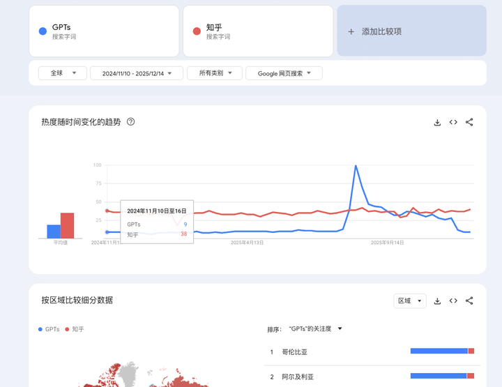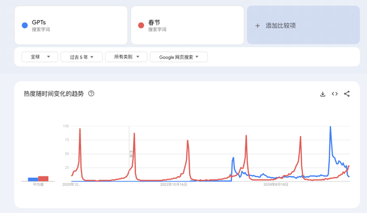我们鼠标放上去,可以看到在美国的 GPTs 与 春节 两词的关注度,会发现春节更好。