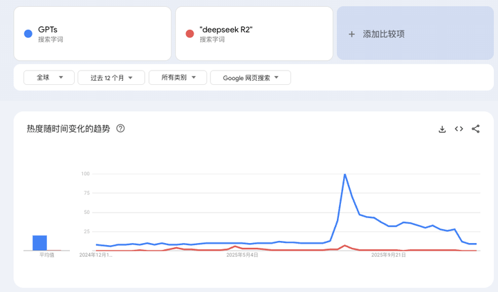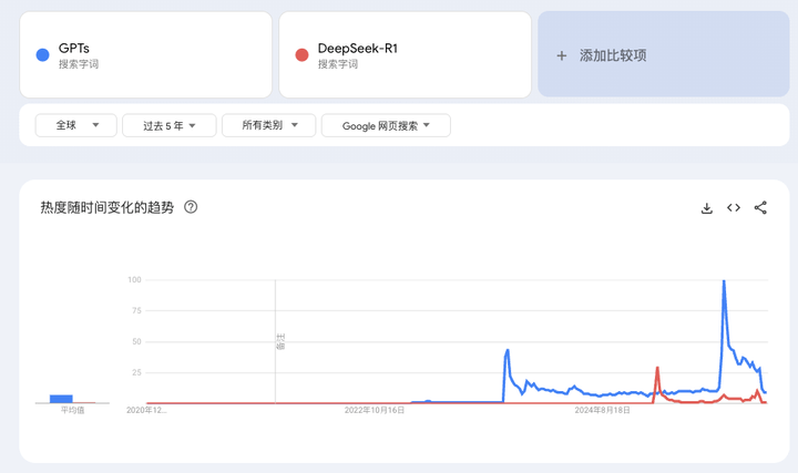 很显然,deepseek R1 的搜索热度,占 deepseek 的总热度里的很小一部分。