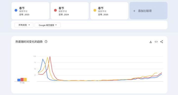 还有一个技巧,看一看过去不同时间段的某关键词的热度比较,比如过去三年,每年的【春节】热度!