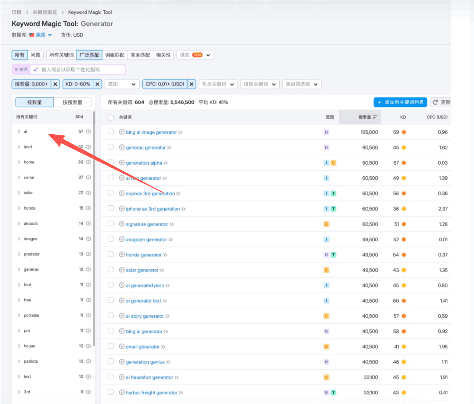 还有【Semrush的关键词概览 -> Keyword Magic Tool】里面,使用筛选工具,这下就大胆去选,30000 以上,也就是日均搜索量 1000 以上(不要嫌少,这些是极度精准的流量,不是自媒体平台里那些泛流量,在自媒体里,用户往往是放松看戏,而上谷歌是真想找服务买东西,1000 是个不小的数字!),以及 KD 在 60 以下的,CPC 大于 0.01 的,之后得到的就是可以无脑去做的词!