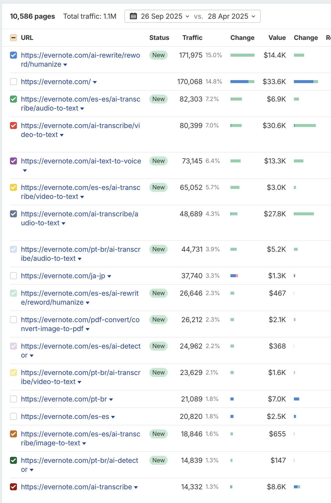 我们做 SEO 都知道,在图文领域,SEO 做的很好的,有可画 canvas ,流量 8 亿,可谓是 SEO 天花板。但还有一个就是国内称为印象笔记的 evernote ,一直也一般,但不知道什么高人指点,最近半年流量好了很多,上月的流量是 1 千万左右。