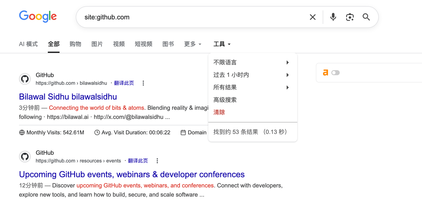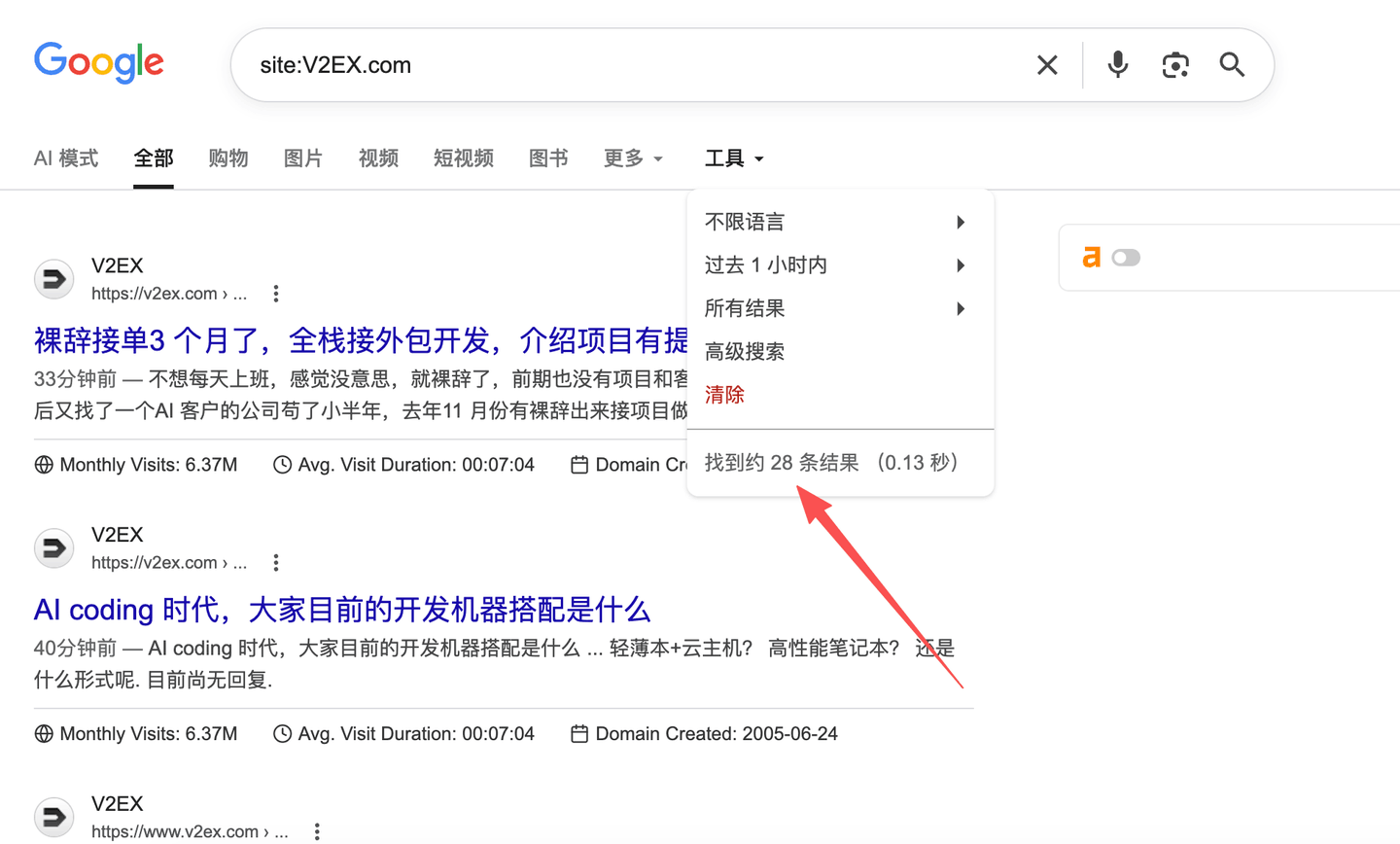 很简单,就是在谷歌,使用 site:example.com ,然后再加个 【过去一小时】筛选 。