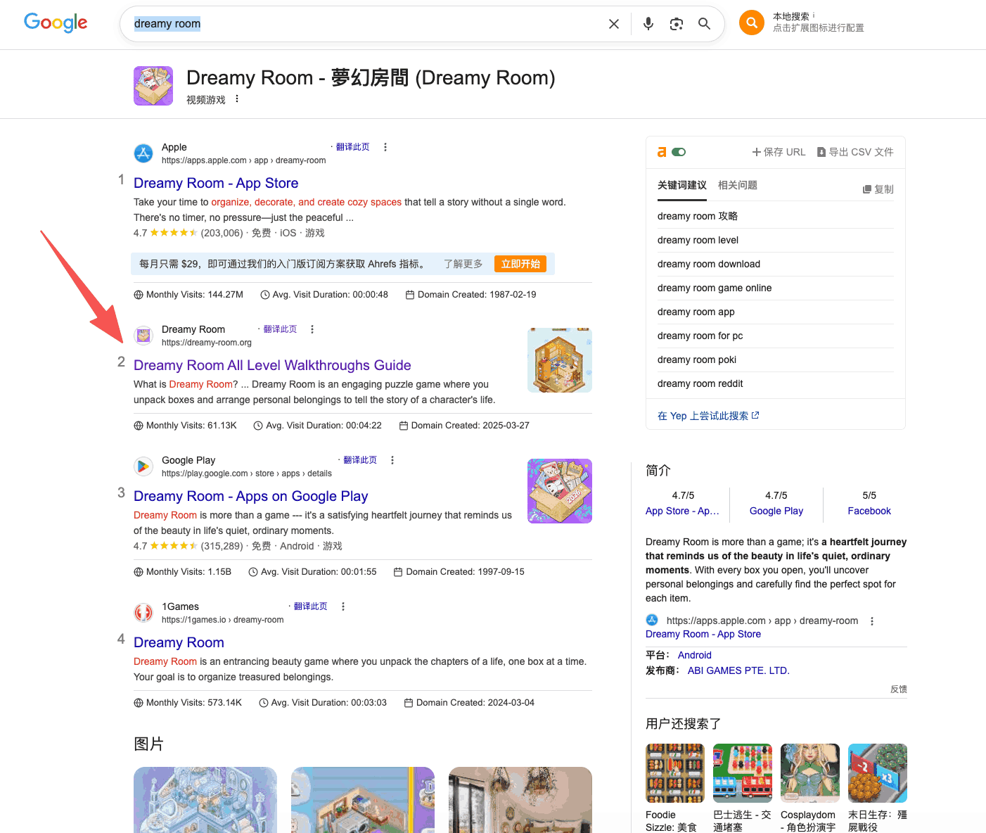 市面上有大量的游戏,但是目前互联网上对这些新老游戏的周边小网站配套,仍不健全。这些游戏名的搜索量都极高,但是竞争难度很小。看看 ahrefs 的免费关键词查询器:
