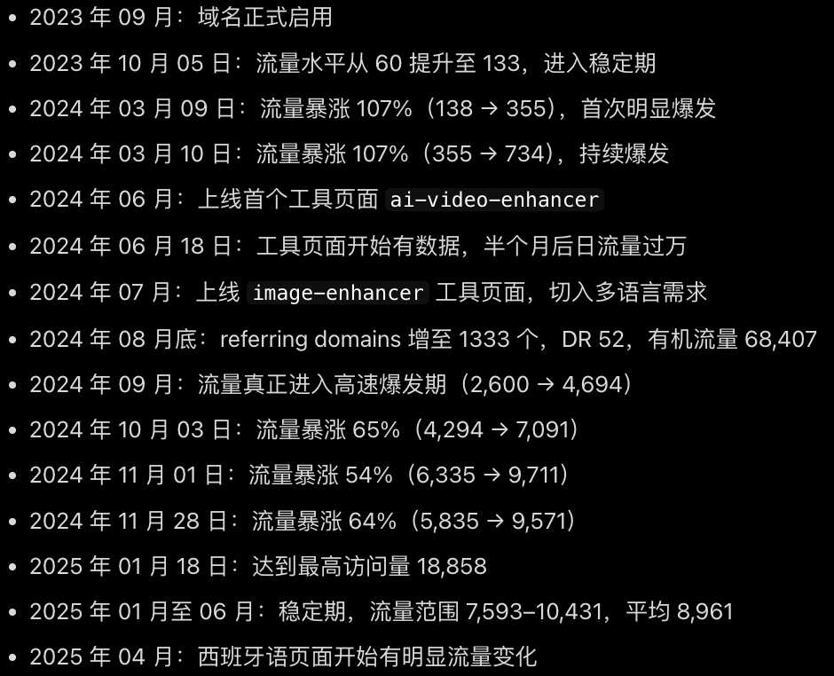 这个站其实有点惨,一直到 2024 年 9 月,才开始有流量。下面是根据 ahrefs 以及相关的研究、整理的时间表。