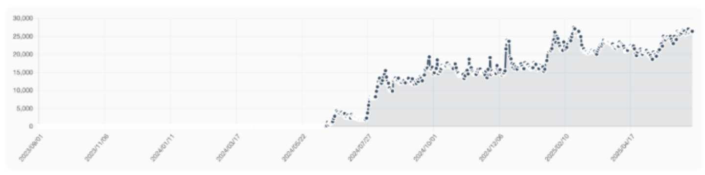 具体的流量走势,如下图所示(仅供参考),是 日 访问量,仅统计搜索引擎来的,中间的流量起点是 2024 年 6 月,最右侧是 2025 年 7 月。