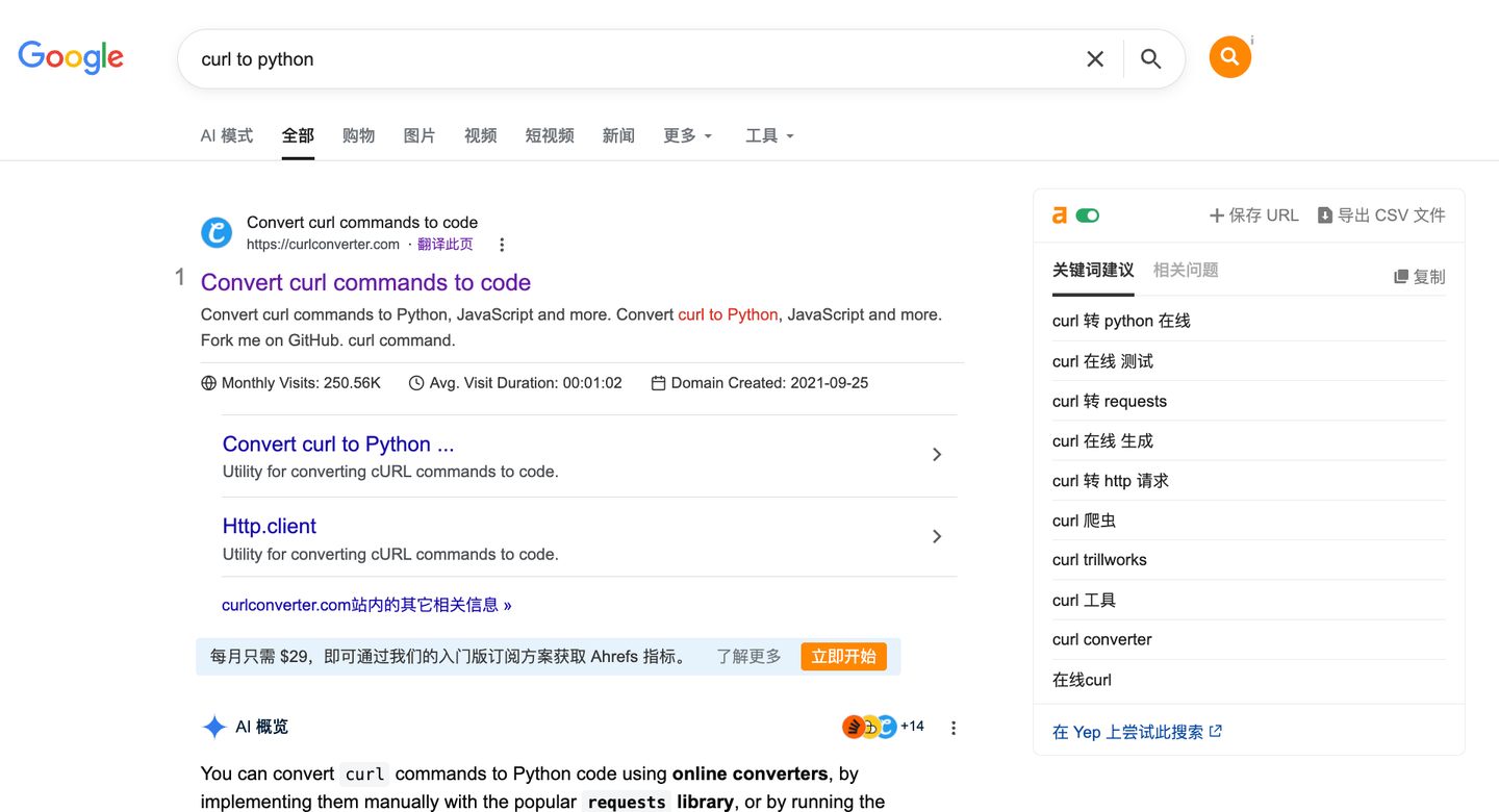 如果说谷歌认可了 curl convert 的关键词,给他 sitelinks 我不意外。但是 curl to python 这个词都拿到了 sitelinks :