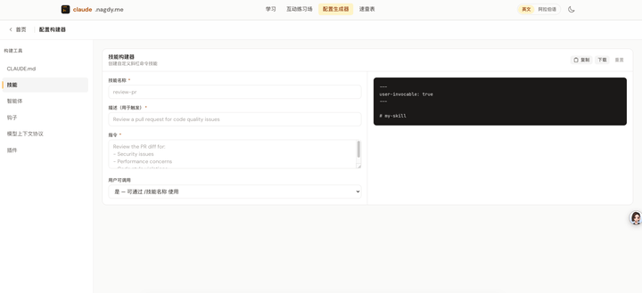 这个交互式教程网站,还贴心的给出了一个,几个我们很常用的 markdown 文档生成器。CLAUDE.md Skill Agent Hook MCP Plugin 这几个功能。