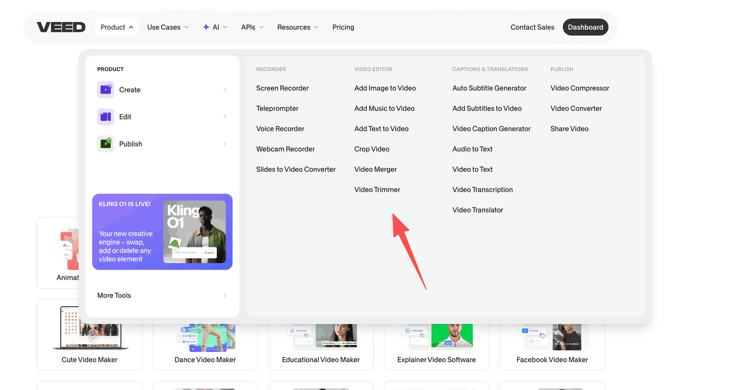 现在,你把产品拿起来,看看它都有什么功能。把所有功能都找到,然后一个个做落地页。这里拿 veed 这个著名的在线视频剪辑软件,举例: