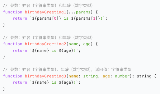 第三个函数,也是 TS ,阅读起来是不是非常舒服。如果你在接受一个复杂的项目,整个代码都是类似于第三种的那种,你肯定喜欢!