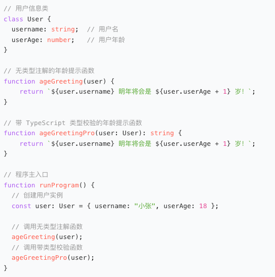 这个 ageGreeting 和 ageGreetingPro 的参数。Pro 版本,是静态类型,我们毫秒间,大脑就能反应过来它传入的是个 Person 对象。而普通版本,你得读文档,然后阅读各个代码库的文件..... 一不小心,你就犯错了。