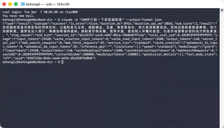 当然 如果你不加后面的 --output-format json 的话,它会直接给你文本,但是在自动化的时候,信息更多一点更好,是吧。
